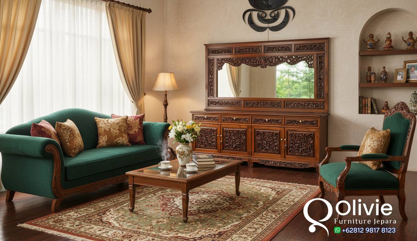 Dengan Bufet Jati Klasik Meja TV Ukiran Jepara, Anda dapat menciptakan ruang yang rapi dan teratur tanpa mengorbankan gaya dan keanggunan. Kesempurnaan untuk mengakomodasi kebutuhan modern Anda sambil mempertahankan pesona klasik yang tak lekang oleh waktu. Dibuat dengan perhatian terhadap kualitas dan desain, kami menawarkan Set Bufet Klasik Mewah Jepara dengan kombinasi yang sempurna antara keindahan estetika dan kepraktisan. Tidak hanya sebagai tempat untuk meletakkan televisi dan perangkat elektronik, tetapi juga sebagai penyimpanan yang elegan untuk koleksi media dan barang-barang lainnya.